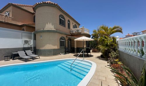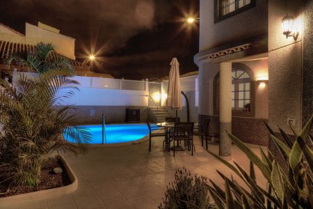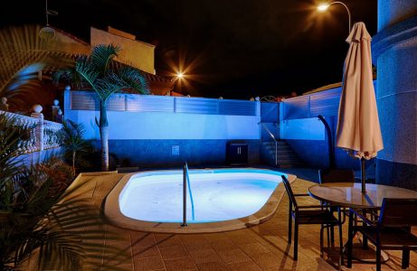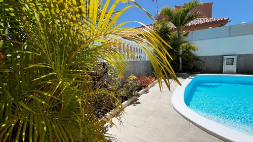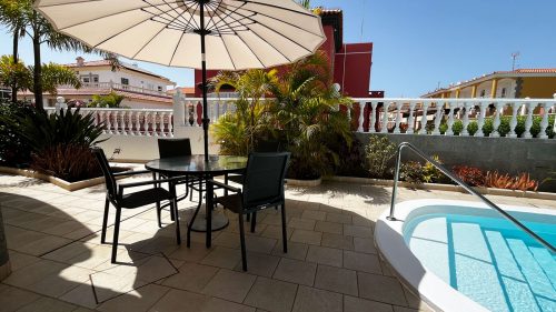 elcome to your private, sun-drenched pool area, surrounded by lush palms and vibrant Canarian plants that create a serene and romantic atmosphere.