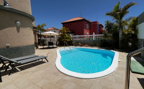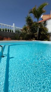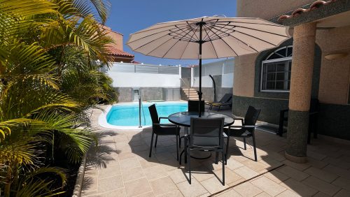 Comfortable sunbeds are arranged around the pool, offering the perfect spot to soak up the sun all day. A charming table and chairs are set up nearby, ideal for enjoying meals or drinks in the open air. The entire area is bathed in sunlight, making it an idyllic retreat for lounging, swimming, or dining, all amidst the beauty of Gran Canaria’s natural plants.