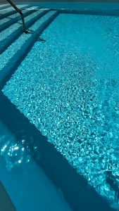 As night falls, the pool area transforms into a magical retreat with soft, glowing pool lights that illuminate the water in beautiful Caribbean hues of turquoise. The gentle curves of the pool shimmer under the lights, creating a serene and romantic ambiance.