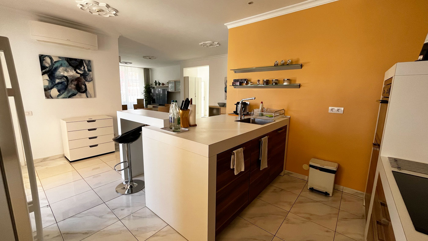 A stylish bar with comfortable bar stools adds a social element to the space, ideal for casual meals or chatting while you cook.