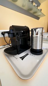 For coffee lovers, there’s a Nespresso coffee machine ready to brew your favorite cup. The kitchen also features a toaster for quick breakfasts and snacks.